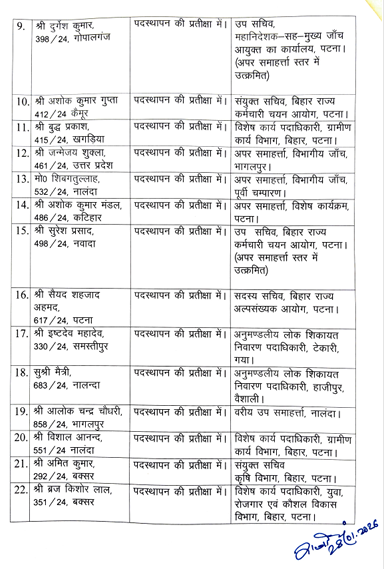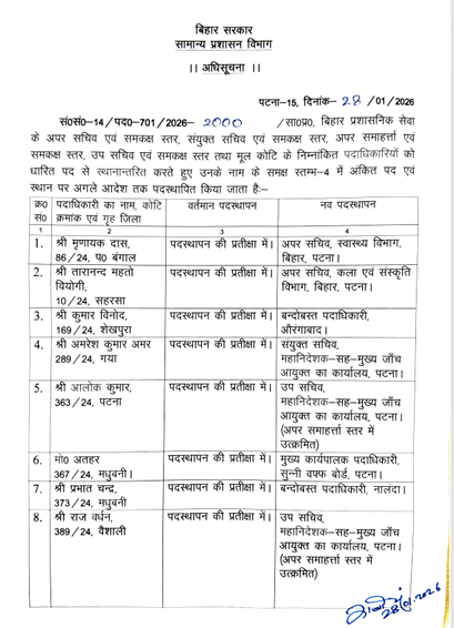 सामान्य प्रशासन विभाग के द्वारा जारी अधिसूचना के अनुसार पदस्थापन की प्रतीक्षा कर रहे मृनायक दास को स्वास्थ्य विभाग में अपर सचिव, तारानंद महतो वियोगी को कला एवं संस्कृति विभाग में अपर सचिव, कुमार विनोद को औरंगाबाद में बंदोबस्त पदाधिकारी, अमरेश कुमार अमर को महानिदेशक सह मुख्य जांच आयुक्त कार्यालय में संयुक्त सचिव, आलोक कुमार को महानिदेशक सह मुख्य जांच आयुक्त कार्यालय में उप सचिव, मो अतहर को सुन्नी वक्फ बोर्ड में मुख्य कार्यपालक पदाधिकारी, प्रभात चंद्र को नालंदा में बंदोबस्त पदाधिकारी, राज वर्धन और दुर्गेश कुमार को महानिदेशक सह मुख्य जांच आयुक्त कार्यालय में उप सचिव, अशोक कुमार गुप्ता को BSSC में संयुक्त सचिव, बुद्ध प्रकाश को ग्रामीण कार्य विभाग में विशेष कार्य पदाधिकारी की जिम्मेवारी दी गई है।