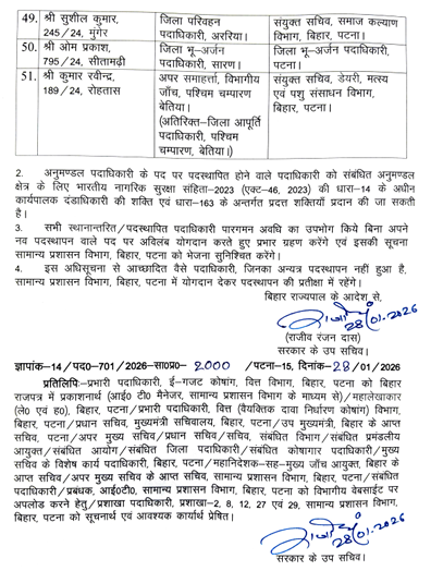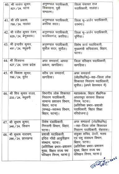 वहीं सिकरहना SDO साकेत कुमार को नालंदा में जिला पंचायत राज पदाधिकारी, अररिया सदर SDO रवि प्रकाश को दरभंगा जिला भू-अर्जन पदाधिकारी, फारबिसगंज SDO रंजीत कुमार रंजन को पूर्णिया में जिला भू-अर्जन पदाधिकारी, सुपौल सदर SDO इंद्रवीर कुमार को मुख्यमंत्री सचिवालय में विशेष कार्य पदाधिकारी, खगड़िया के आपदा प्रबंधन अपर समाहर्ता विजयंत को खगड़िया में जिला परिवहन पदाधिकारी, खगड़िया वरीय उप समाहर्ता विकास कुमार को सुपौल में लोक शिकायत निवारण पदाधिकारी अपर समाहर्ता सह जिला लोक शिकायत निवारण पदाधिकारी बनाया गया है।