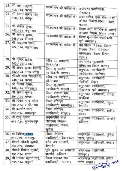 इसके साथ ही जन्मेजय शुक्ला को भागलपुर में विभागीय जांच अपर समाहर्ता, शिबगतुल्लाह को पूर्वी चंपारण में विभागीय जांच अपर समाहर्ता, अशोक कुमार मंडल को विशेष कार्यक्रम अपर समाहर्ता, सुरेश प्रसाद को BSSC में उप सचिव, सैयद शहजाद अहमद को अल्पसंख्यक आयोग में सदस्य सचिव, इष्टदेव महादेव को टेकारी में अनुमंडलीय लोक शिकायत निवारण पदाधिकारी, मैत्री को हाजीपुर में अनुमंडलीय लोक शिकायत निवारण पदाधिकारी, आलोक चंद्र चौधरी को नालन्दा में वरीय उप समाहर्ता, विशाल आनंद को ग्रामीण कार्य विभाग में विशेष कार्य पदाधिकारी, अमित कुमार को कृषि विभाग में संयुक्त सचिव, ब्रज किशोर लाल को युवा, रोजगार एवं कौशल विकास विभाग में विशेष कार्य पदाधिकारी, नवीन कुमार को रोहतास में बंदोबस्त पदाधिकारी, हेमंत कुमार सिंह को युवा, रोजगार एवं कौशल विकास विभाग में अपर सचिव, राकेश कुमार को समाज कल्याण विभाग में विशेष कार्य पदाधिकारी, अरुण कुमार को पूर्वी चंपारण में जिला भू-अर्जन पदाधिकारी, आशुतोष रंजन को बिहार विकास मिशन, मंत्रिमंडल सचिवालय विभाग का उप मिशन निदेशक की जिम्मेदारी दी गई है।