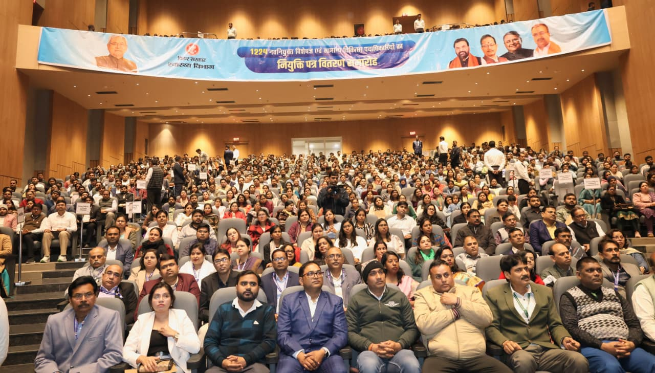 पटना: मुख्यमंत्री नीतीश कुमार ने शनिवार को ऊर्जा ऑडिटोरियम में स्वास्थ्य विभाग द्वारा आयोजित कार्यक्रम में 1224 नवनियुक्त विशेषज्ञ एवं सामान्य चिकित्सा पदाधिकारियों को नियुक्ति पत्र प्रदान किया। इस दौरान मुख्यमंत्री ने अनुभव प्रकाश, मृणाल कुमार, रौशन कुमार, नेहा कुमारी, रविरंजन कुमार, उत्कर्ष शर्मा, आशीष रंजन, आलोक रंजन एवं अभिषेक कुमार को सांकेतिक रूप से नियुक्ति पत्र प्रदान किया।