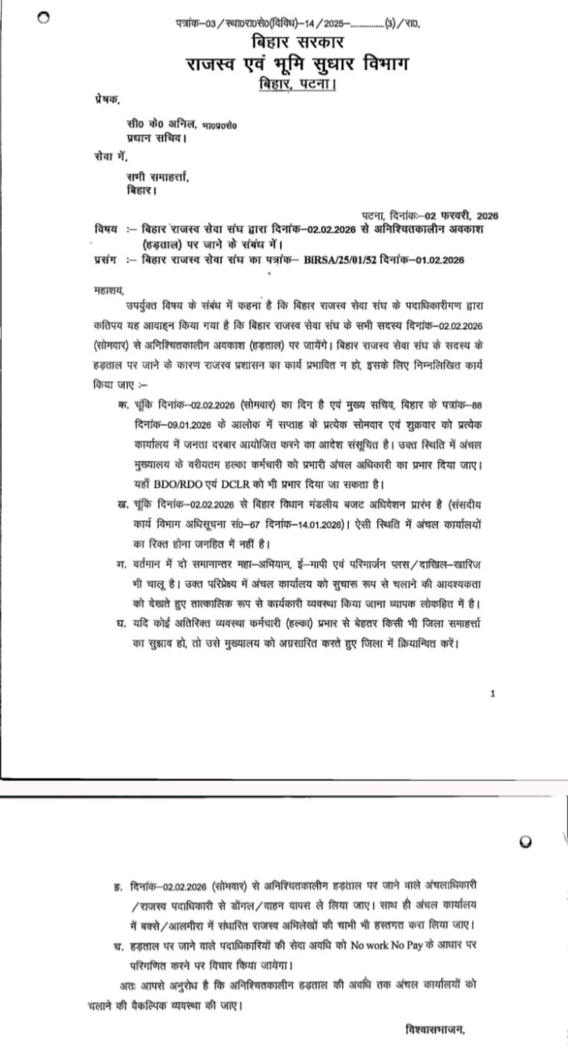 दरअसल बिहार राज्य राजस्व सेवा एसोसिएशन के सदस्यों ने सोमवार से अनिश्चितकालीन हड़ताल शुरू की और पहले ही दिन राजस्व विभाग के प्रधान सचिव सी के अनिल ने बड़ी कार्रवाई कर दी। उन्होंने सभी जिलों के समाहर्ता को पत्र लिख कर आदेश जारी किया कि जिस अंचल के अंचलाधिकारी एवं अन्य राजस्व कर्मी हड़ताल पर जा रहे हैं उनकी जगह पर मुख्यालय के वरीय कर्मियों को अंचलाधिकारी का प्रभार दे दिया जाए। इसके साथ ही हड़ताल पर गए अधिकारियों और कर्मियों से उनकी गाड़ी, डोंगल, कार्यालय के सभी अलमीरा और बक्से की चाभी ले ली जाये। इसके साथ ही प्रधान सचिव ने हड़ताल पर गए सभी कर्मियों के हड़ताल के दौरान नो वर्क नो पेमेंट के आधार पर वेतन की कटौती भी की जाये।