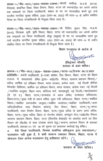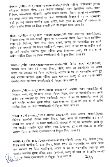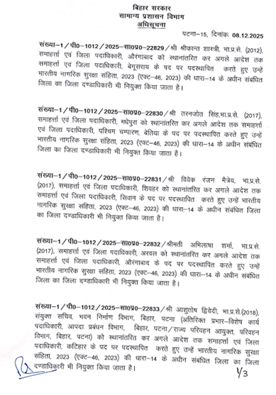 राज्य सरकार ने सूचना एवं जन-संपर्क विभाग में निदेशक के पद पर तैनात वैभव श्रीवास्तव को सारण का जिलाधिकारी बनाया है। इसके साथ ही औरंगाबाद के डीएम श्रीकांत शास्त्री को बेगूसराय, मधेपुरा के डीएम तरनजोत सिंह को पश्चिम चंपारण, शिवहर के डीएम विवेक रंजन मैत्रेय को सीवान, अरवल की डीएम अभिलाषा शर्मा को औरंगाबाद का डीएम बनाया है। जबकि भवन निर्माण विभाग के संयुक्त सचिव आशुतोष द्विवेदी को कटिहार का डीएम, बिहार एड्स नियंत्रण सोसाइटी की परियोजना निदेशक प्रतिभा रानी को शिवहर की डीएम, खान एवं भू-तत्व विभाग के खान निदेशक विनोद दूहन को अररिया का जिलाधिकारी बनाया है।