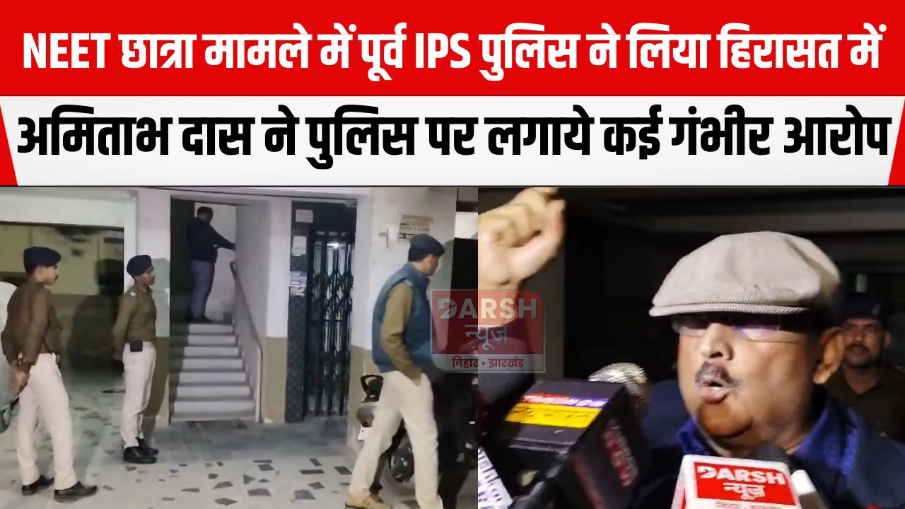 छापेमारी के दौरान पुलिस ने पूर्व IPS अमिताभ दास को हिरासत में ले लिया और उन्हें लेकर थाना चली गई। इस दौरान पूर्व IPS अमिताभ दास ने एक बार फिर मुख्यमंत्री नीतीश कुमार के बेटे पर गंभीर आरोप लगाते हुए कहा कि नीट छात्रा कांड मामले में निशांत कुमार मुख्य आरोपी हैं। मैं इस मामले में CBI डायरेक्टर को सबूत देने के लिए दिल्ली जाने वाला था उसके पहले मेरी अवैध गिरफ्तारी हो गई है। इस दौरान मीडिया ने जब उनसे सबूत के बारे में पूछा तो उन्होंने कहा कि मैं सारे सबूत CBI को दूंगा। उन्होंने पुलिस पर भी कई गंभीर आरोप लगाया और कहा कि अभी मेरी हत्या करने की भी कोशिश की गई है। उन्होंने कहा कि इन लोगों ने मुझे कुछ चुभा दिया है। इस दौरान मौके पर पहुंची मेडिकल टीम के सदस्यों ने कहा कि पूर्व IPS अमिताभ दास का ब्लड प्रेशर चेक किया गया है और वह ठीक है।