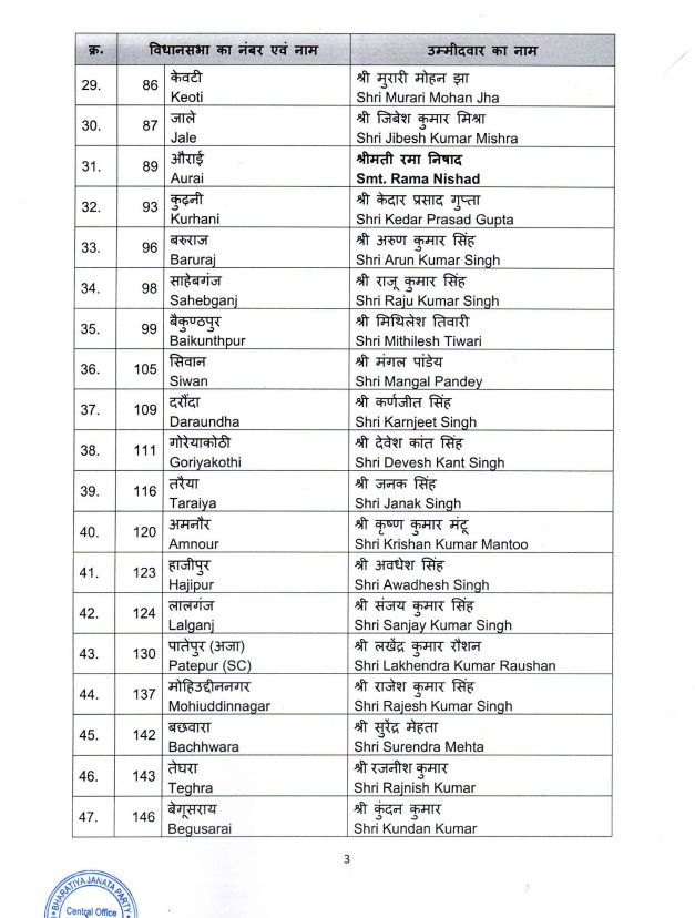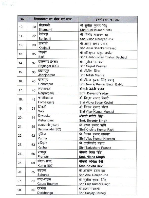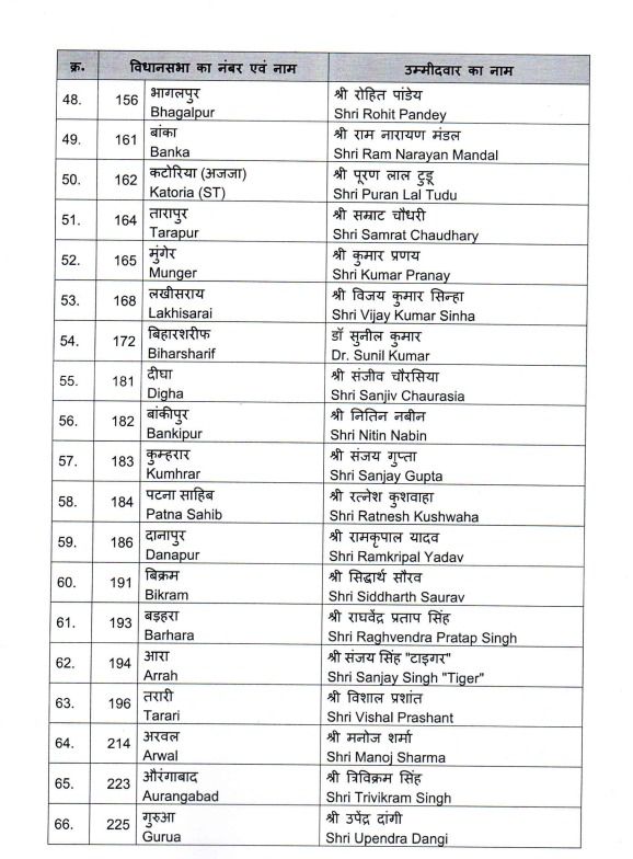 भाजपा ने पूर्व उप मुख्यमंत्री रेणु देवी को बेतिया, उप मुख्यमंत्री सम्राट चौधरी को तारापुर, उप मुख्यमंत्री विजय सिन्हा को लखीसराय, खेल मंत्री सुरेंद्र मेहता को बछवाड़ा, पार्टी के हिन्दुत्ववादी और फायर ब्रांड नेता हरिभूषण ठाकुर बचौल को बिस्फी, मंत्री नीतीश मिश्रा को झंझारपुर, मंत्री नीरज कुमार सिंह बबलू को छातापुर, पूर्व उप मुख्यमंत्री तारकिशोर प्रसाद को कटिहार, मंत्री संजय सरावगी को दरभंगा, जीबेश मिश्रा को दरभंगा, मंगल पाण्डेय को सिवान, पूर्व केंद्रीय मंत्री रामकृपाल यादव को दानापुर, मंत्री प्रेम कुमार को गया शहर और श्रेयसी सिंह को जमुई से उम्मीदवार बनाया है।