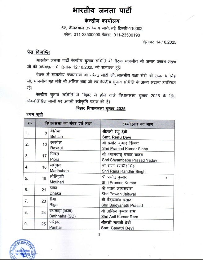 पटना: बिहार विधानसभा चुनाव को लकर NDA में चल रही खींचतान और नाराजगी कि दौर के बीच बड़ी खबर आ रही है। NDA के मुख्य सहयोगी दल भारतीय जनता पार्टी ने अपने 71 सीटों पर उम्मीदवारों की सूची जारी कर दी है। जारी सूची के अनुसार अब उप मुख्यमंत्री सम्राट चौधरी को भी चुनाव लड़ना पड़ेगा साथ ही कई विधायकों के टिकट को रिपीट किया गया है।