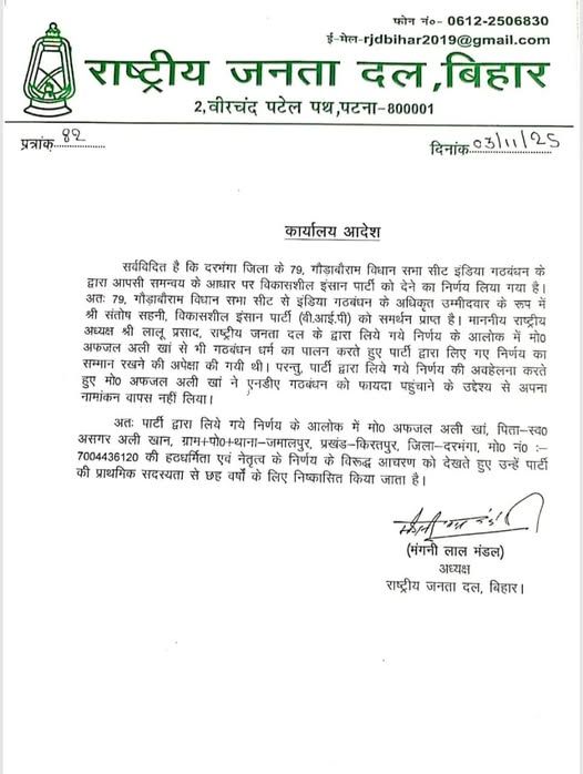 राजद सुप्रीमो लालू यादव के निर्देश पर प्रदेश अध्यक्ष मंगनी लाल मंडल ने एक पत्र जारी करते हुए गौरा बौराम विधानसभा सीट से राजद प्रत्याशी मो अफजल अली खान को पार्टी से बाहर कर दिया है। उनके ऊपर पार्टी के निर्देशों की अवहलेना करने और विपक्षी दलों के उम्मीदवार को फायदा पहुँचाने के लिए चुनाव लड़ने का आरोप लगा कर राजद से निष्काषित कर दिया गया है। राजद प्रदेश अध्यक्ष मंगनी लाल मंडल ने अपने पत्र में लिखा है कि गठबंधन में आपसी समन्वय के आधार पर पार्टी ने VIP के प्रत्याशी संतोष सहनी को समर्थन देने का निर्णय लेते हुए अफजल अली खान को अपना नामांकन वापस लेने का निर्देश दिया था।