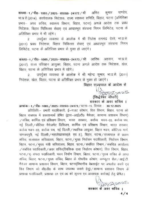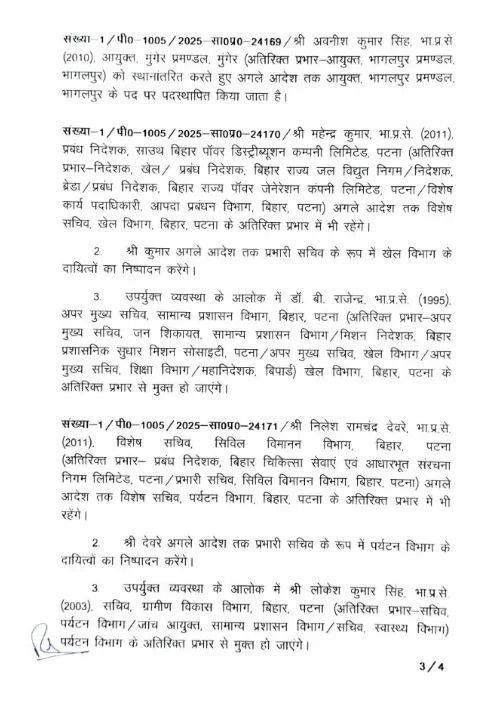 सिविल विमानन विभाग के विशेष सचिव निलेश रामचंद्र देवरे को पर्यटन विभाग के विशेष सचिव का अतिरिक्त प्रभार दिया गया है। अब ग्रामीण विकास विभाग के सचिव लोकेश कुमार सिंह अब पर्यटन विभाग के प्रभारी सचिव के अतिरिक्त दायित्व से मुक्त हो जायेंगे। राज्य स्वास्थ्य समिति के कार्यपालक निदेशक अमित कुमार पांडेय को बिहार चिकित्सा सेवाएँ एवं आधारभूत संरचना निगम लिमिटेड के प्रबंध निदेशक का अतिरिक्त प्रभार दिया गया है। इसके बाद अब IAS निलेश रामचंद्र देवरे बिहार चिकित्सा सेवाएं एवं आधारभूत संरचना निगम लिमिटेड के प्रबंध निदेशक के अतिरिक्त प्रभार से मुक्त हो जायेंगे।