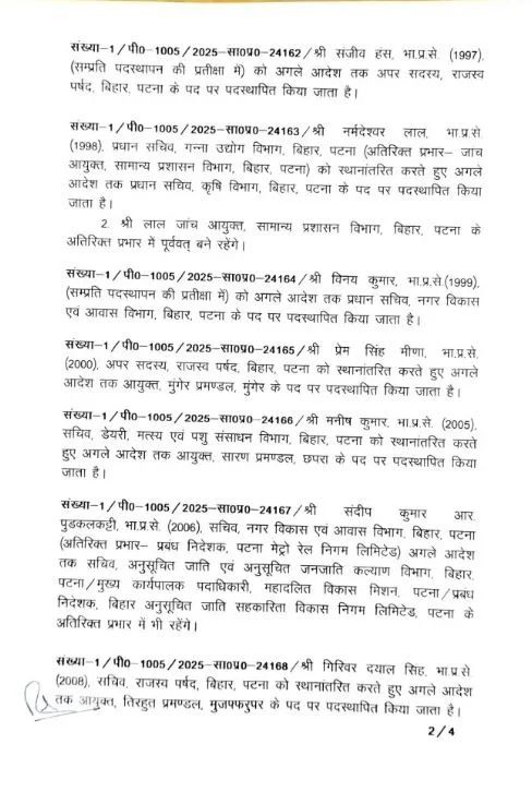 कृषि विभाग के प्रधान सचिव पंकज कुमार को ग्रामीण विकास विभाग के प्रधान सचिव के रूप में स्थानांतरित किया गया है। वे सामान्य प्रशासन विभाग में जांच आयुक्त के अतिरिक्त प्रभार में बने रहेंगे। गन्ना उद्योग विभाग के प्रधान सचिव नर्मदेश्वर लाल को कृषि विभाग में प्रधान सचिव बनाया गया है। वे सामान्य प्रशासन विभाग में जांच आयुक्त के अतिरिक्त प्रभार में बने रहेंगे। राजस्व पर्षद के अपर सदस्य प्रेम सिंह मीणा को मुंगेर प्रमंडल का आयुक्त बनाया गया है जबकि डेयरी, मत्स्य एवं पशु संसाधन विभाग के सचिव मनीष कुमार को सारण प्रमंडल का आयुक्त बनाया गया है। नगर विकास एवं आवास विभाग के सचिव संदीप कुमार आर पुडकलकट्टी को पटना मेट्रो रेल निगम लिमिटेड के प्रबंध निदेशक के साथ ही अब महादलित विकास मिशन में मुख्य कार्यपालक पदाधिकारी और बिहार अनुसूचित जाति सहकारिता विकास निगम लिमिटेड के प्रबंध निदेशक का अतिरिक्त प्रभार दिया गया है।