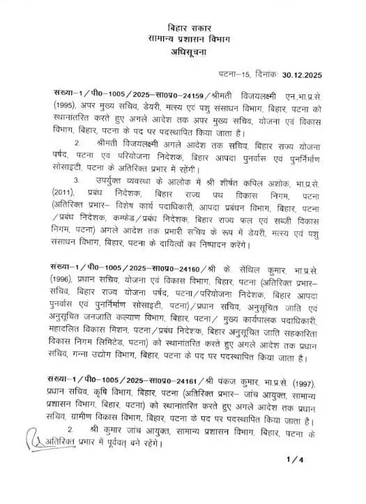 सामान्य प्रशासन विभाग के द्वारा जारी अधिसूचना के अनुसार डेयरी, मत्स्य एवं पशु संसाधन विभाग की अपर मुख्य सचिव एन विजयलक्ष्मी को योजना एवं विकास विभाग का अपर मुख्य सचिव बनाया गया है। इसके साथ ही उन्हें बिहार राज्य योजना पर्षद में सचिव तथा बिहार आपदा पुनर्वास एवं पुनर्निर्माण सोसाइटी के निदेशक का अतिरिक्त प्रभार भी दिया गया है। इसके साथ ही बिहार राज्य पथ विकास निगम के प्रबंध निदेशक शीर्षत कपिल अशोक को डेयरी, मत्स्य एवं पशु संसाधन विभाग के प्रभारी सचिव का दायित्व दिया गया है। वहीं योजना एवं विकास विभाग के प्रधान सचिव के शेंथिल कुमार को गन्ना उद्योग विभाग का प्रधान सचिव बनाया गया है।