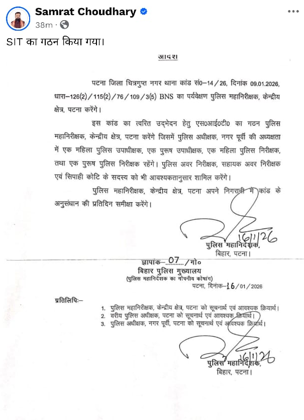 डीजीपी के द्वारा आदेश जारी किये जाने के बाद गृह मंत्री सम्राट चौधरी ने भी सोशल मीडिया पर पोस्ट कर मामले की जानकारी दी। उन्होंने सोशल मीडिया पर पोस्ट किया कि SIT गठित कर दी गई।