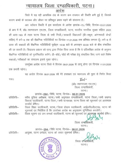 पटना के जिलाधिकारी डॉ त्यागराजन एस एम ने इस संबंध में आदेश जारी किया है। डीएम ने अपने जारी आदेश में कहा है कि ठंड के प्रतिकूल प्रभाव को देखते हुए प्री-स्कूल से 8वीं कक्षा तक के छात्रों की शैक्षणिक गतिविधियों पर रोक लगाता हूं। स्कूलों में पठन-पाठन पर 11 जनवरी तक प्रतिबंध रहेगा। वहीं 8वीं कक्षा से ऊपर के कक्षाओं के बच्चों का पठन पाठन कार्य सुबह 10:30 बजे से दोपहर 03:30 बजे तक ही किया जा सकता है। इस आदेश से प्री-बोर्ड और बोर्ड परीक्षाएं मुक्त होंगी।