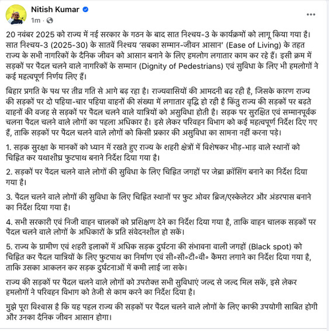 सड़क पर चलना हर नागरिक का अधिकार है। लेकिन अक्सर तेज रफ्तार गाड़ियों के बीच पैदल चलने वाले लोग खुद को असुरक्षित महसूस करते हैं। अब बिहार में इस सोच को बदलने की ठोस शुरुआत हो गई है। 20 नवंबर 2025 को नई सरकार के गठन के बाद “सात निश्चय-3 (2025-30)” कार्यक्रम लागू किया गया। इसके सातवें निश्चय ‘सबका सम्मान-जीवन आसान’ के तहत आम लोगों के जीवन को सरल और सुरक्षित बनाने की दिशा में बड़े कदम उठाए जा रहे हैं। खास तौर पर पैदल यात्रियों के सम्मान और सुरक्षा पर जोर दिया गया है।