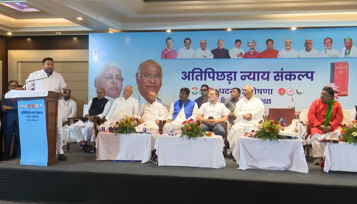 पटना: बिहार विधानसभा चुनाव को लेकर इन दिनों सियासी हलचल काफी तेज है। बुधवार को राजधानी पटना में कांग्रेस कार्यसमिति की बैठक के बाद महागठबंधन अतिपिछड़ा न्याय संकल्प कार्यक्रम का आयोजन किया जहां राहुल गांधी ने अतिपिछड़े वर्ग के लोगों को दस गारंटी दी। वहीं इस सम्मेलन को संबोधित करते हुए बिहार विधानसभा में नेता प्रतिपक्ष तेजस्वी यादव ने अभी हमलोगों ने संयुक्त रूप से अतिपिछड़ा न्याय संकल्प पेश किया है। इसमें अगर आगे सुधार करने की जरूरत पड़ी तो वह किया जायेगा। तेजस्वी ने कहा कि हमारी लड़ाई संविधान और लोकतंत्र बचाने की है साथ ही सामाजिक न्याय की भी है। अब समय की जरूरत है कि हमलोग सामाजिक न्याय के साथ ही आर्थिक न्याय भी करें।