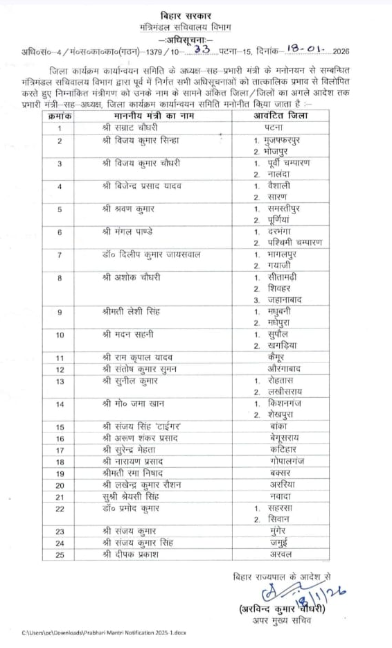 उप मुख्यमंत्री सह गृह मंत्री सम्राट चौधरी को पटना जिला की जिम्मेदारी दी गई है जबकि उप मुख्यमंत्री विजय कुमार सिन्हा को मुजफ्फरपुर और भोजपुर की। इसके साथ ही सीएम नीतीश के खास विजय चौधरी को पूर्वी चंपारण और नालंदा, वित्त मंत्री विजेंद्र यादव को वैशाली और सारण की जिम्मेदारी दी गई है जबकि श्रवण कुमार को समस्तीपुर और पूर्णिया, मंगल पांडेय को दरभंगा और पश्चिमी चंपारण, दिलीप जायसवाल को भागलपुर और गया जी, लेशी सिंह को मधुबनी और मधेपुरा, मदन सहनी को सुपौल और खगड़िया, सुनील कुमार को रोहतास और लखीसराय, मो जमा खान को किशनगंज और शेखपुरा तथा प्रमोद कुमार को सहरसा और सीवान की जिम्मेदारी दी गई है।