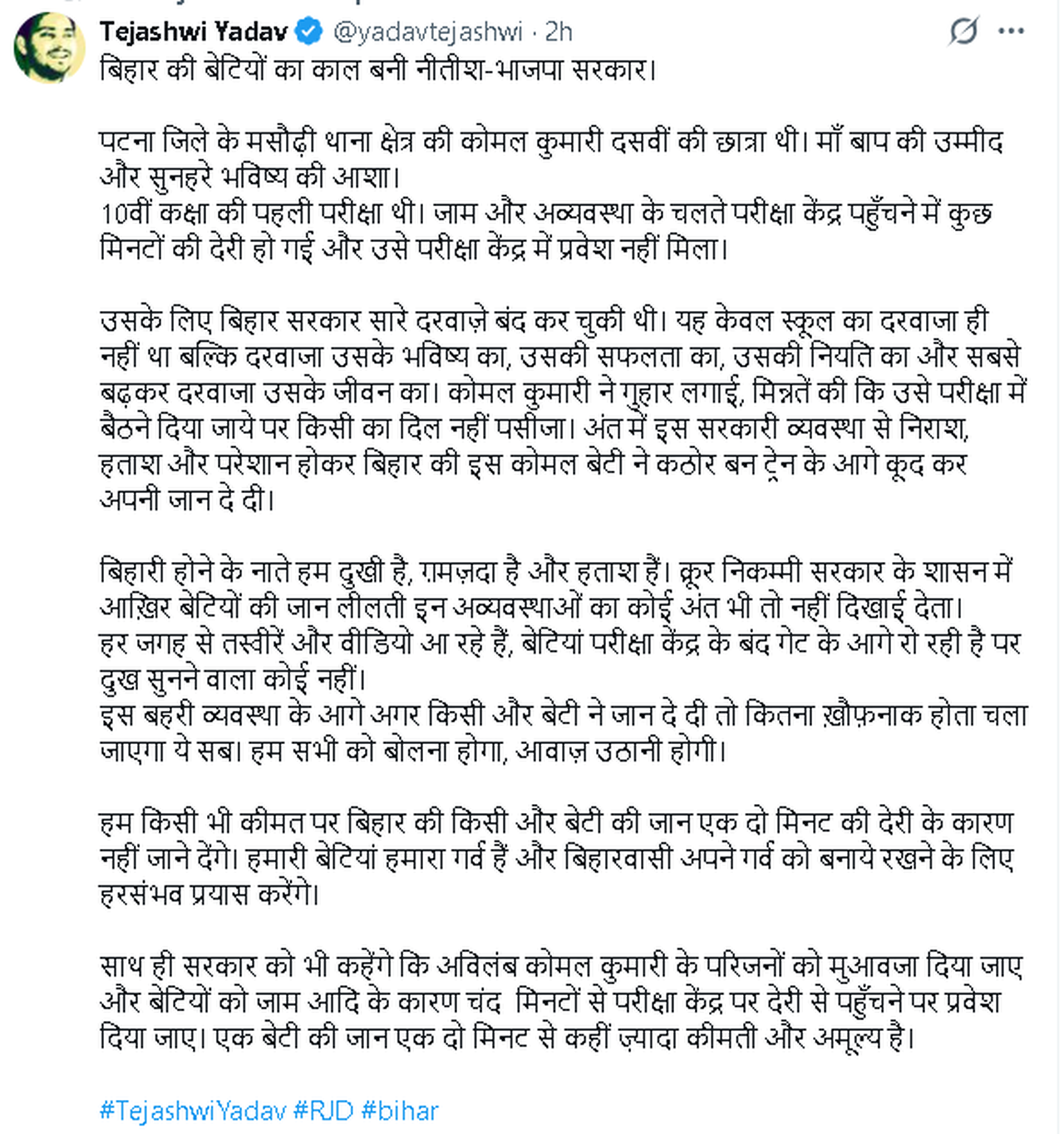 करीब 15 दिन बाद सदन पहुंचे तेजस्वी यादव ने भी कड़ी टिप्पणी की। उन्होंने कहा कि भाजपा सरकार महिलाओं के लिए “काल” बन गई है और आज सदन में इस मुद्दे पर सत्ता पक्ष को घेरेंगे। इसी बीच हाई कोर्ट से 42 विधायकों को नोटिस मिलने के मामले पर अजय कुमार ने प्रतिक्रिया देते हुए कहा कि नोटिस का जवाब दिया जाएगा। उन्होंने कहा कि चुनाव के दौरान चुनाव आयोग पर सवाल उठना स्वाभाविक है और SIR (स्पेशल इंटेंसिव रिवीजन) पूरे राज्य में एक साथ लागू होना चाहिए था। मसौढ़ी की इस घटना ने परीक्षा व्यवस्था और मानवीय संवेदनशीलता पर गंभीर सवाल खड़े कर दिए हैं।