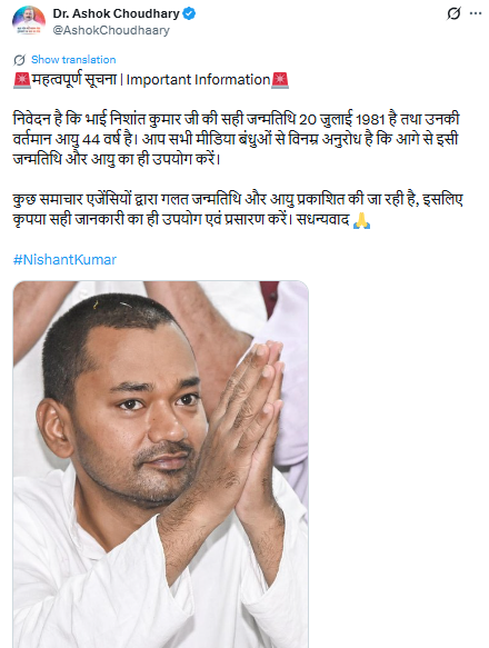 मंत्री अशोक चौधरी ने सोशल मीडिया पर पोस्ट कर निशांत कुमार की सही जन्मतिथि बताते हुए जानकारी दी है कि उनकी उम्र महज 44 वर्ष है न कि 51। उन्होंने सोशल मीडिया पर लिखा कि 'महत्वपूर्ण सूचना | Important Information : निवेदन है कि भाई निशांत कुमार जी की सही जन्मतिथि 20 जुलाई 1981 है तथा उनकी वर्तमान आयु 44 वर्ष है। आप सभी मीडिया बंधुओं से विनम्र अनुरोध है कि आगे से इसी जन्मतिथि और आयु का ही उपयोग करें। कुछ समाचार एजेंसियों द्वारा गलत जन्मतिथि और आयु प्रकाशित की जा रही है, इसलिए कृपया सही जानकारी का ही उपयोग एवं प्रसारण करें। सधन्यवाद