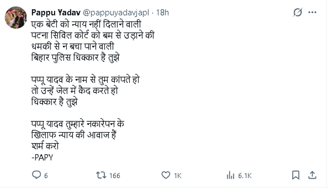 पप्पू यादव इस समय बेऊर जेल में बंद हैं। हाल ही में उन्हें 31 साल पुराने एक मामले में जमानत मिल चुकी है, लेकिन दूसरे केस में सुनवाई लंबित होने के कारण उन्हें फिर न्यायिक हिरासत में भेज दिया गया। इसी बीच कोर्ट को बार-बार मिल रही धमकियों के कारण सुनवाई टलती जा रही है, जिससे न सिर्फ न्यायिक प्रक्रिया बाधित हो रही है बल्कि आम लोगों का भरोसा भी प्रभावित हो रहा है।