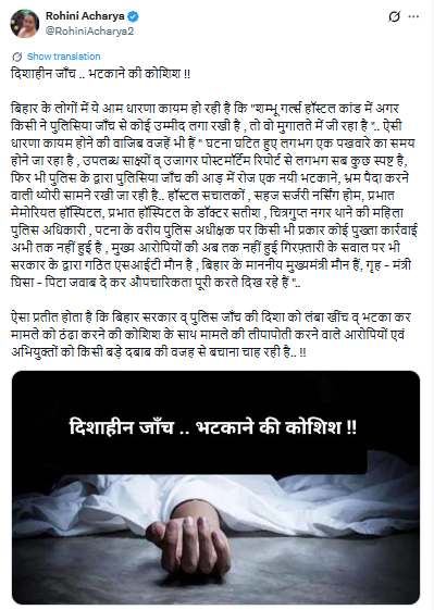 रोहिणी आचार्य ने अपने सोशल मीडिया पोस्ट में लिखा है कि 'दिशाहीन जाँच .. भटकाने की कोशिश !! बिहार के लोगों में ये आम धारणा कायम हो रही है कि "शम्भू गर्ल्स हॉस्टल कांड में अगर किसी ने पुलिसिया जाँच से कोई उम्मीद लगा रखी है , तो वो मुगालते में जी रहा है ".. ऐसी धारणा कायम होने की वाजिब वजहें भी हैं " घटना घटित हुए लगभग एक पखवारे का समय होने जा रहा है , उपलब्ध साक्ष्यों व् उजागर पोस्टमॉर्टेम रिपोर्ट से लगभग सब कुछ स्पष्ट है, फिर भी पुलिस के द्वारा पुलिसिया जाँच की आड़ में रोज एक नयी भटकाने, भ्रम पैदा करने वाली थ्योरी सामने रखी जा रही है.. हॉस्टल सचालकों , सहज सर्जरी नर्सिंग होम, प्रभात मेमोरियल हॉस्पिटल, प्रभात हॉस्पिटल के डॉक्टर सतीश , चित्रगुप्त नगर थाने की महिला पुलिस अधिकारी , पटना के वरीय पुलिस अधीक्षक पर किसी भी प्रकार कोई पुख्ता कार्रवाई अभी तक नहीं हुई है , मुख्य आरोपियों की अब तक नहीं हुई गिरफ़्तारी के सवाल पर भी सरकार के द्वारा गठित एसआईटी मौन है , बिहार के माननीय मुख्यमंत्री मौन हैं, गृह - मंत्री घिसा - पिटा जवाब दे कर औपचारिकता पूरी करते दिख रहे हैं ".. ऐसा प्रतीत होता है कि बिहार सरकार व् पुलिस जाँच की दिशा को लंबा खींच व् भटका कर मामले को ठंढा करने की कोशिश के साथ मामले की लीपापोती करने वाले आरोपियों एवं अभियुक्तों को किसी बड़े दबाब की वजह से बचाना चाह रही है.. !!