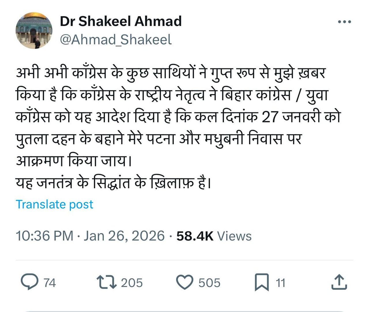 बिहार की राजनीति में एक बार फिर कांग्रेस के भीतर का टकराव खुलकर सामने आ गया है। पूर्व केंद्रीय मंत्री शकील अहमद के हालिया बयान और उनके एक्स पोस्ट ने पार्टी के अंदरूनी हालात पर गंभीर सवाल खड़े कर दिए हैं। शकील अहमद ने दावा किया है कि कांग्रेस के राष्ट्रीय नेतृत्व के निर्देश पर बिहार कांग्रेस और युवा कांग्रेस उनके पटना और मधुबनी स्थित आवास पर पुतला दहन के बहाने हमला कर सकती है। अगर यह दावा सही है, तो यह न सिर्फ पार्टी अनुशासन बल्कि लोकतांत्रिक मूल्यों के भी खिलाफ माना जाएगा।