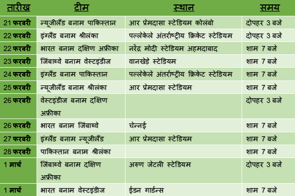 ICC टी-20 विश्वकप मैच में सुपर 8 में खेलने वाली टीमों का सिलेक्शन उनके परफॉरमेंस के आधार पर हो गया है। सुपर 8 में पहुंचे टीमों के मैच का शेड्यूल भी जारी कर दिया गया है। सुपर 8 में पहुँचने वाली टीमों को दो ग्रुप में बांटा गया है जिसमें दोनों ही ग्रुप में टॉप रहने वाली टीम को सेमीफाइनल में खेलने का मौका मिलेगा। सुपर 8 के गुप 1 में भारत को रखा गया है जबकि ग्रुप 2 में पाकिस्तान को। ग्रुप 1 में भारत के साथ दक्षिण अफ्रीका, जिंबाबे और वेस्ट इंडीज को रखा गया है तो दूसरी तरफ ग्रुप 2 में पाकिस्तान के साथ न्यूजीलैंड, इंग्लैंड और श्रीलंका को रखा गया है। दोनों ही ग्रुप में टॉप पर रहने वाली टीमों को सेमीफाइनल में खेलने का मौका मिलेगा।