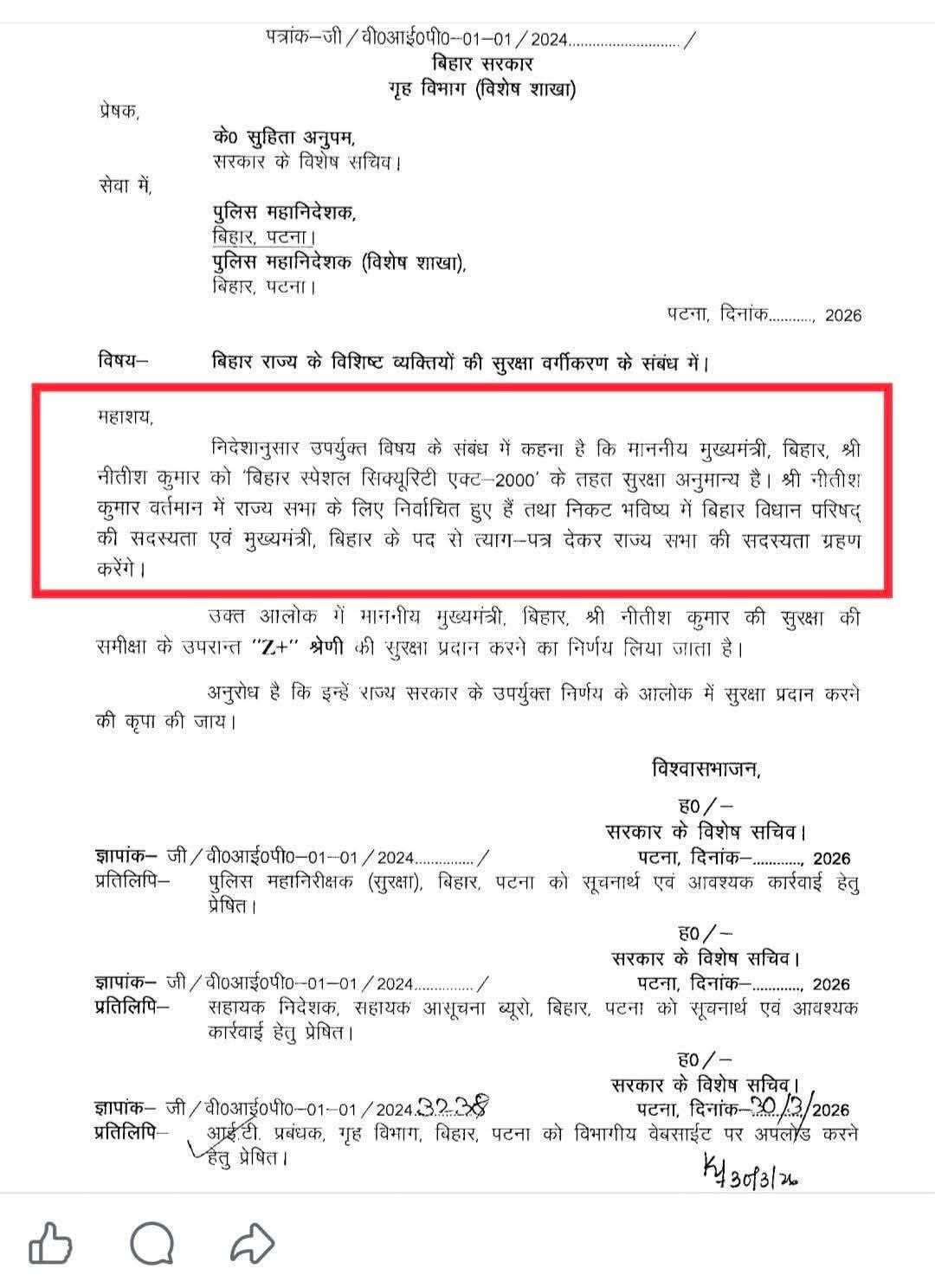 दरअसल गृह विभाग की तरफ से 30 मार्च को जारी एक पत्र में लिखा गया है कि मुख्यमंत्री नीतीश कुमार को बिहार स्पेशल सिक्यूरिटी एक्ट 2000 के तहत सुरक्षा अनुमान्य है। वह वर्तमान में राज्यसभा के लिए निर्वाचित हुए हैं तथा निकट भविष्य में विधान परिषद की सदस्यता तथा मुख्यमंत्री पद से त्याग पत्र दे कर राज्यसभा की सदस्यता ग्रहण करेंगे। उक्त आलोक में मुख्यमंत्री की सुरक्षा की समीक्षा की गई और उन्हें Z+ सुरक्षा प्रदान करने का निर्णय लिया गया है। गृह विभाग ने इस पत्र को लेकर गृह विभाग पर निशाना साधा है।