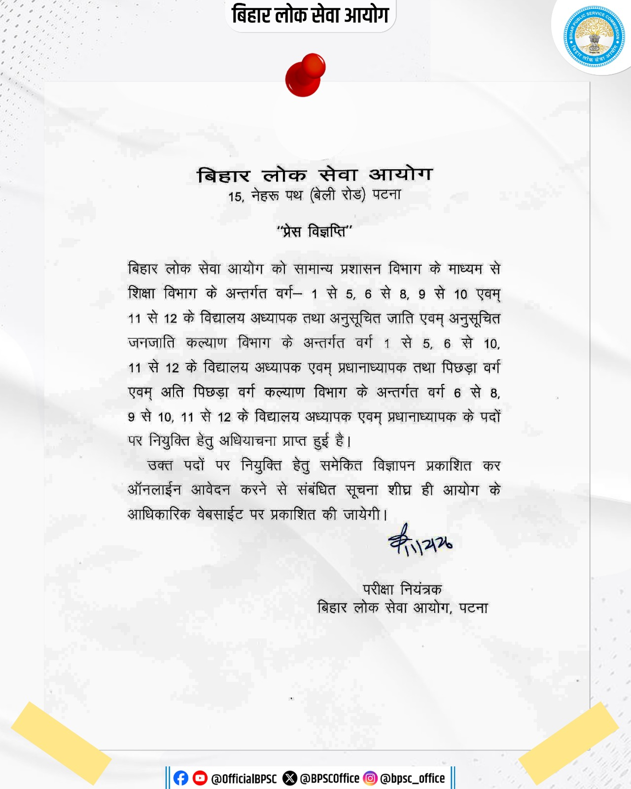 BPSC के अधिसूचना के अनुसार कक्षा एक से कक्षा 12 तक के लिए अध्यापक और प्रधानाध्यापक की नियुक्ति की जाएगी। मिली जानकारी के अनुसार आयोग कक्षा 1 से 8 तक 20 हजार, कक्षा 9-10 के लिए 12 हजार, कक्षा 11-12 के लिए 13 हजार के करीब पदों पर भर्ती का विज्ञापन जल्द ही जारी करेगा। बता दें कि शिक्षक भर्ती परीक्षा की मांग को लेकर राजधानी पटना में अभ्यर्थियों ने कई बार धरना प्रदर्शन भी किया और सरकार तथा BPSC से जल्द ही विज्ञापन जारी करने की मांग की। अब शिक्षा विभाग ने अधियाचना आयोग को भेज दी है जिसके बाद अब भर्ती की प्रक्रिया शुरू कर दी गई है।